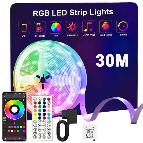 LED Strip 30 m RGB LED Strip with Bluetooth App and Remote Control, LED Strips for Kitchen, Bedroom Decoration, Party, TV Backlight