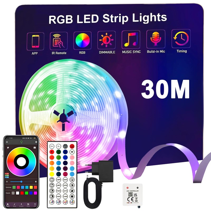 - Bluetooth app and IR control: LED strip 30 m have a Bluetooth app and a 44-key IR remote control. The app is compatible with all types of smartphones and allows you to change millions of colours, adjust the brightness and adjust modes at different speeds. Or you can control the RGB LED strips light up via an IR remote control.