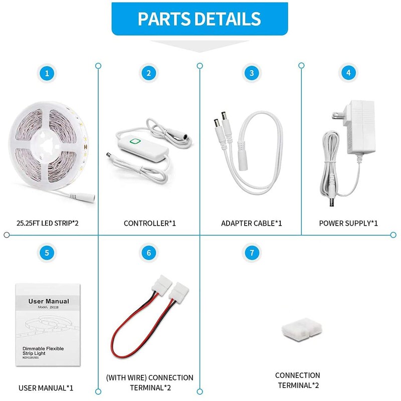 - Safe to Use: The led tape light works in 24v low voltage with a ETL and FCC listed power adapter with short circuit protection, and the led ribbon lights certificated by SGS with energy-saving, low heat, touchable and long lifetime features. You can use it safely.