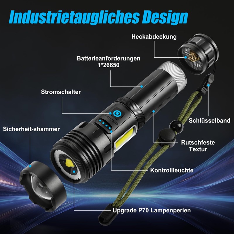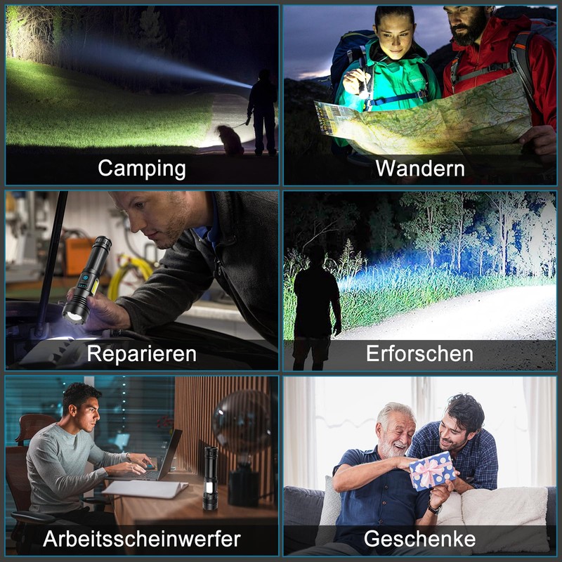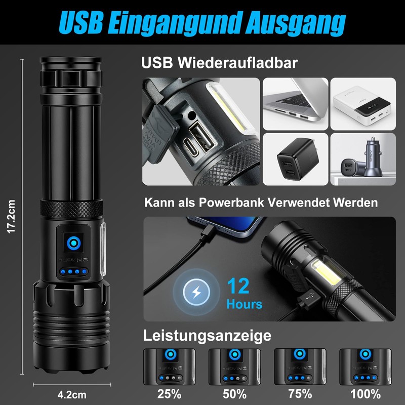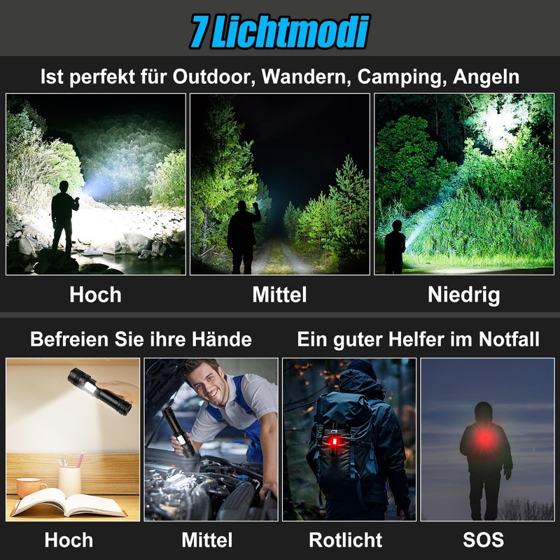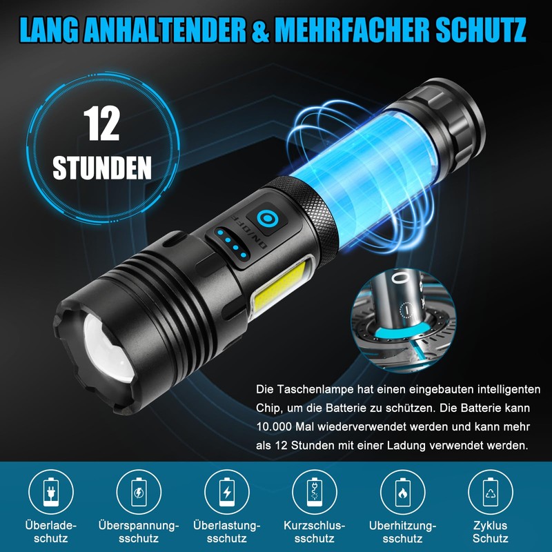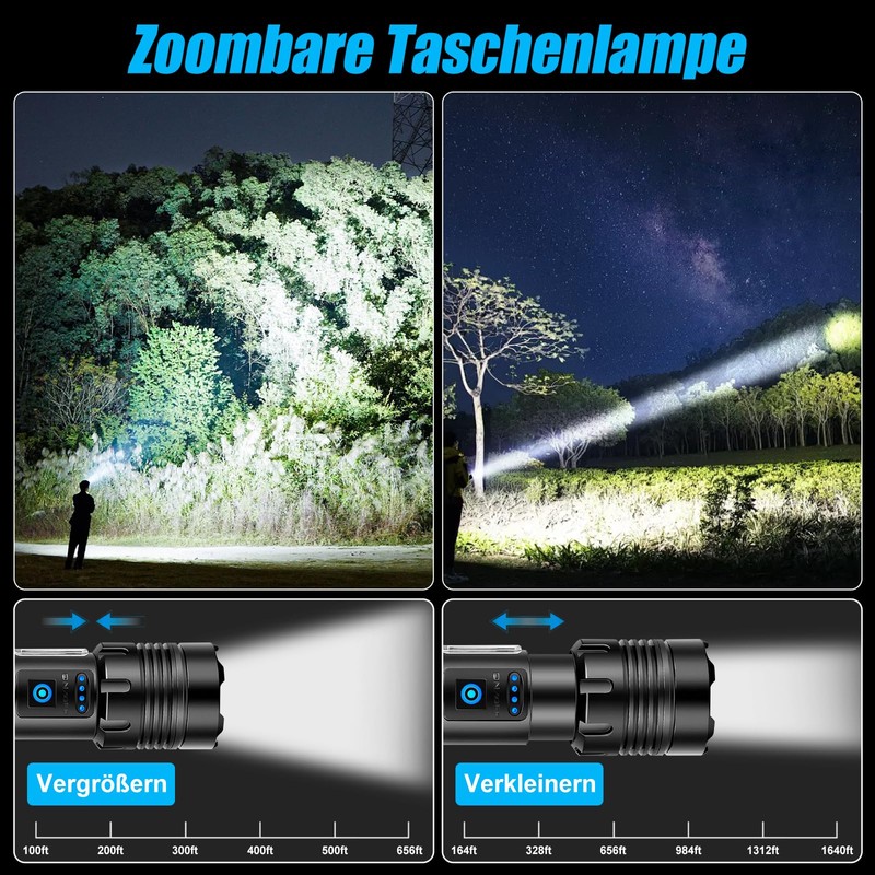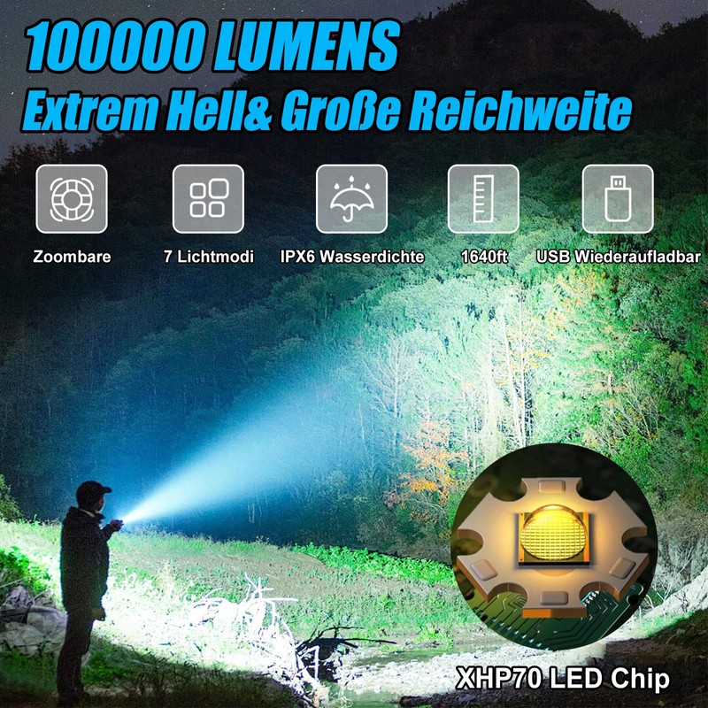 - 【100000 Lumen extrem hell】Wiederaufladbare Taschenlampen mit integriertem fortschrittlichem P70-Chip für das hellste Licht. Eine LED-Taschenlampe hat eine Leistung von 100.000 Lumen, was ausreicht, um ein großes Feld und Ihren Garten mühelos zu beleuchten. Die Leuchtweite der hellen Taschenlampe beträgt über 500 Meter. Perfekt für Outdoor, Wandern, Jagen, Camping, Angeln, Notfälle und auch ein ideales Geschenk für Männer.