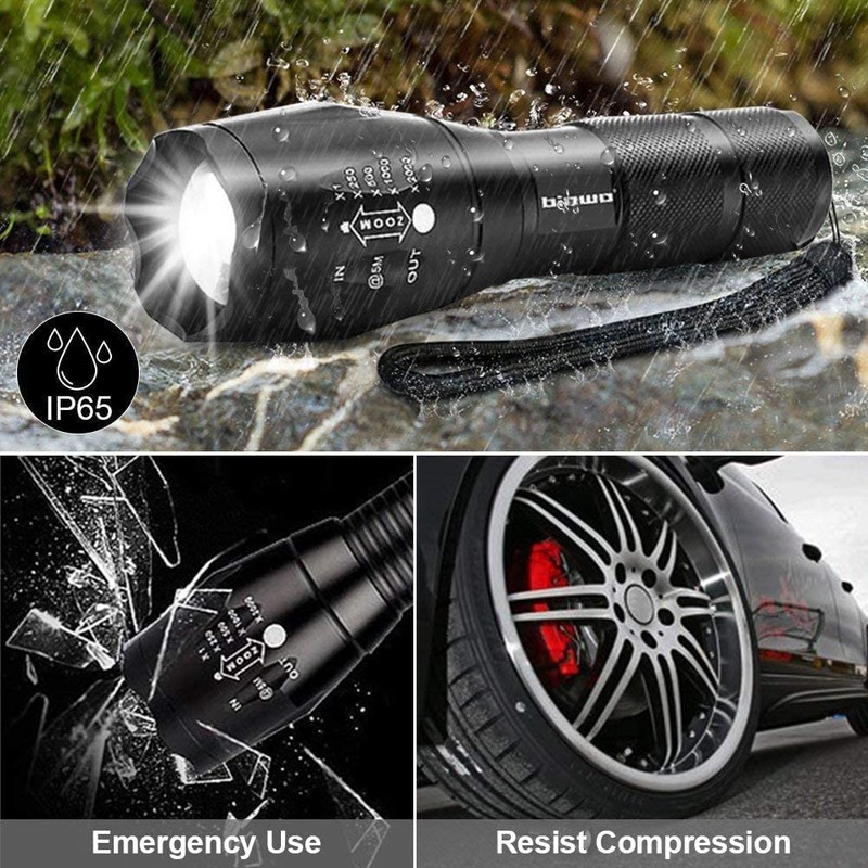 - Adjustable focus and body material: thanks to the zoomable design, the illuminated area of the torch can be adjusted. With the aluminium alloy of aviation, this torch is strong and robust enough for long application time.