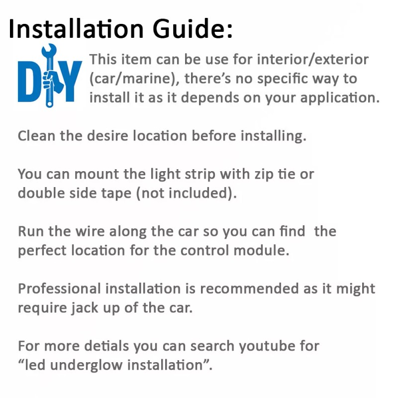 - Durable and could be used at anywhere that equiped with 12 V power, like car, van, boat, truck ATV UTV offroad underbody glow.