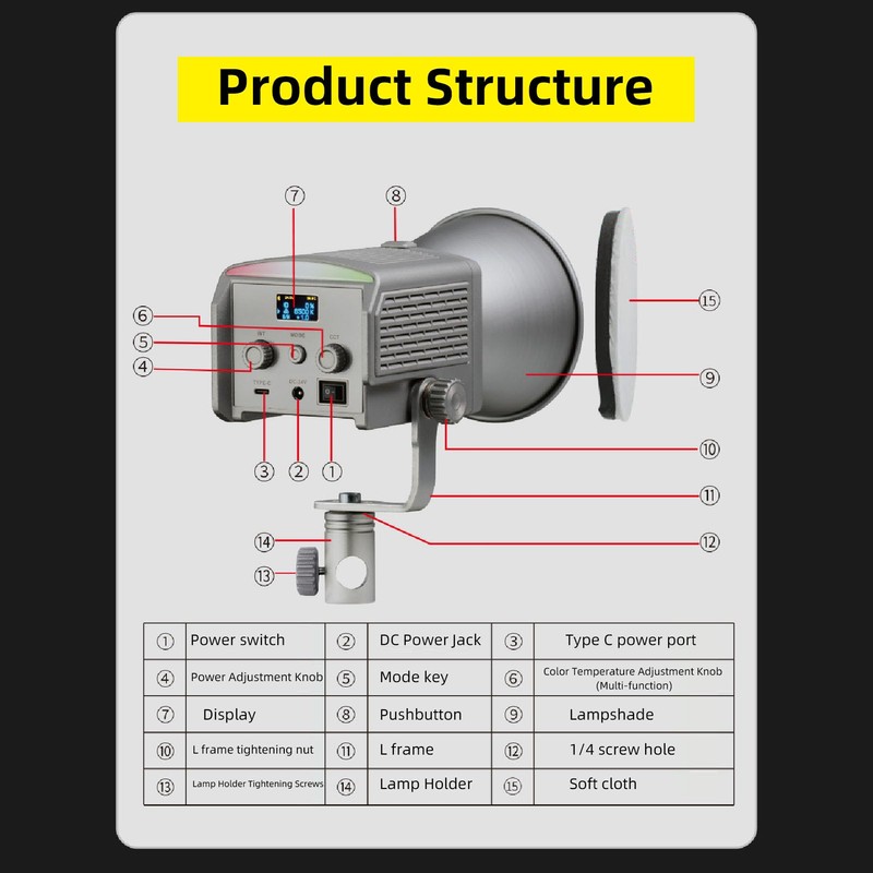 4. Aluminum Alloy Construction: Constructed with premium ABS and aluminum alloy, the housing is robust, accommodating softboxes and reflectors. The tripod adapter allows 360° adjustments, and the standard reflector protects the LED, offering versatile lighting setups.