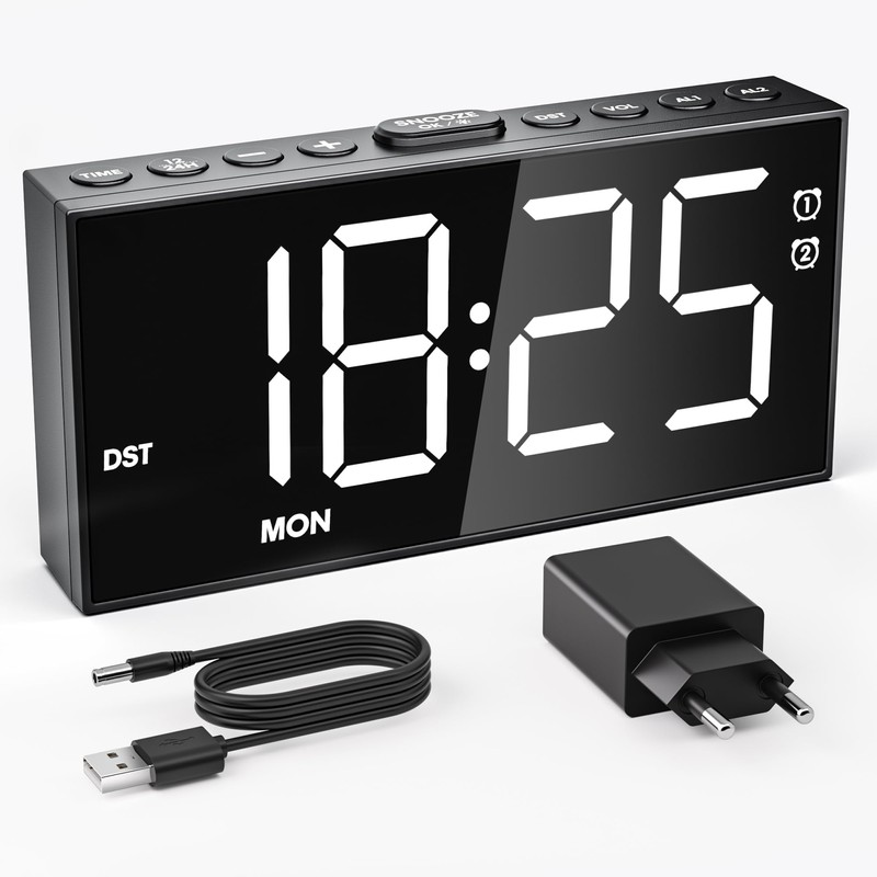 Unser Wecker zwei separate Weckerzeiten gleichzeitig einstellen, mit einem Sommerzeit modi. Auf der Rückseite des weckers befindet sich außerdem ein USB/Type-C-Ausgang, 5 einstellbare Projektionshelligkeiten und Alarmvolumenspiegel, drei Alarm-Modi. Klarer LED Anzeige, die das Lesen auch über große Entfernungen erleichtern.
