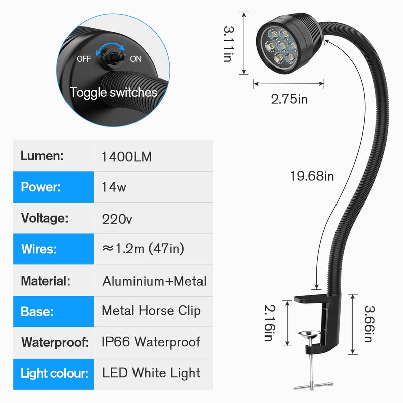 Our self-developed 14W machine light integrates 7 led beads with a luminous flux of about 1400 lumens and adopts IP66 waterproof technology; the swan neck adopts a double-sided design, with an outer layer of plastic and an inner layer of metal; Efficient , energy-saving, Environmental friendly and eye protection are our most basic quality