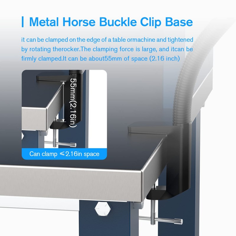 - 💡Metal Strong Horse Mouth Clamp base:The clip is adjustable, and the maximum opening distance is 2.1 inches. It can be easily installed on any flat surface with exposed edges, such as a desk, workbench, shelf, or table