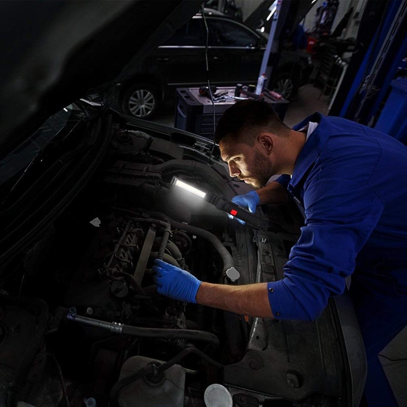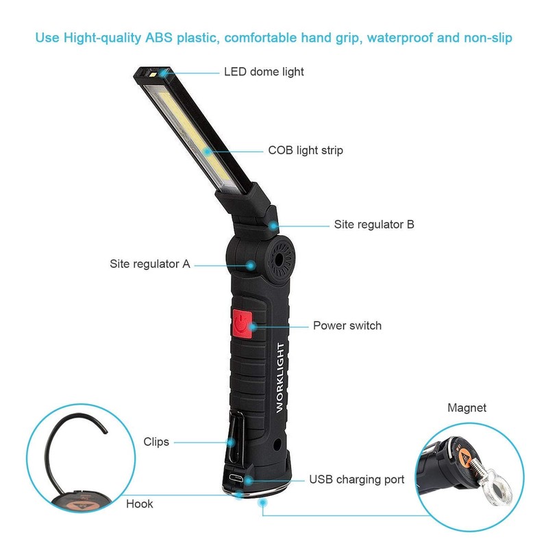 - ✔5 Working Modes & Waterproof: Super bright COB light has 5 Lighting modes: High Brightness / Medium Brightness / Front Light / Red Warning / Strobe Red. Press for 3 seconds to switch COB red light. IP44 Waterproof rating, ensure the rechargeable work light works fine in rainy days