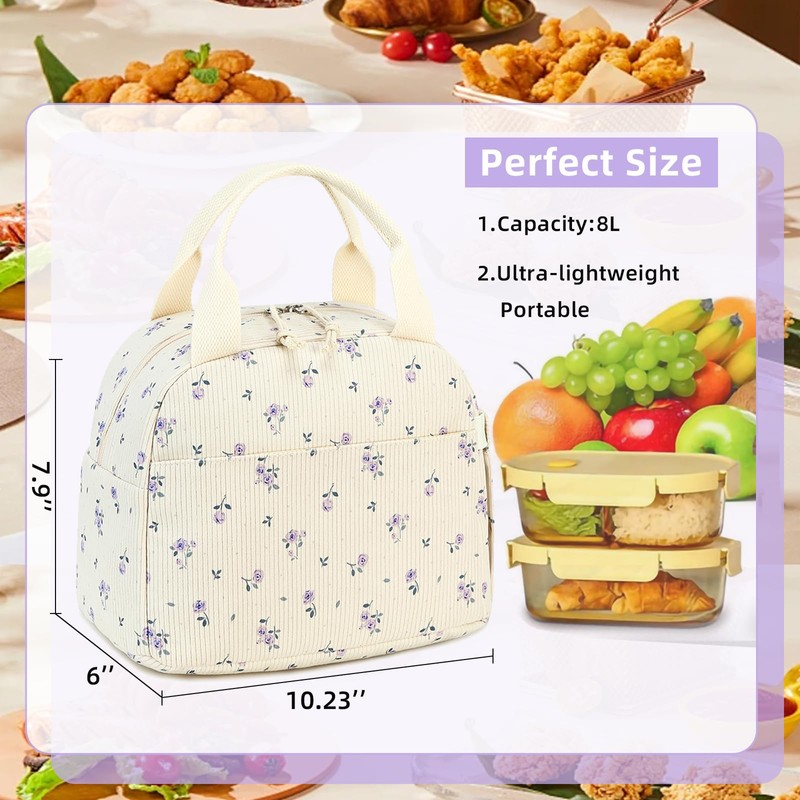 LEDAOU Insulated Lunch Box Women Reusable Lunch Bag Cord Lunch Tote Handbags Leakproof Thermal Cooler Lunch Case Large Capacity (Purple Flower 178)