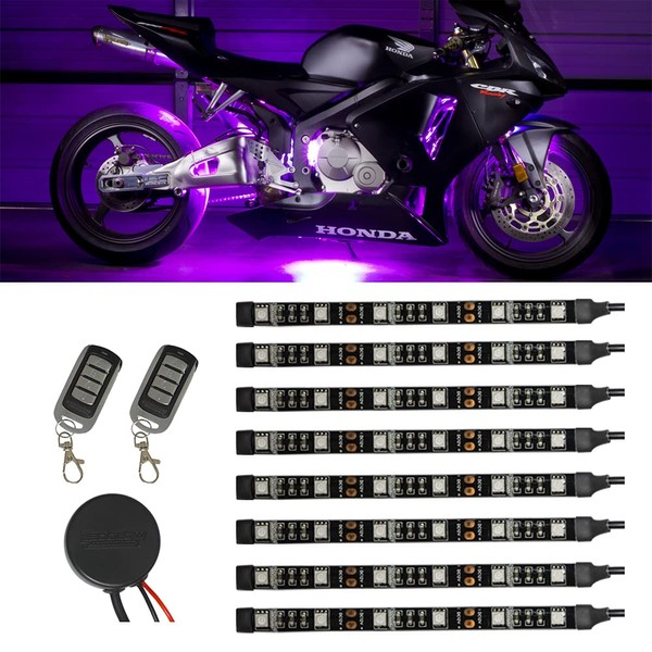 LEDGlow 8pc Advanced Purple LED Motorcycle Accent Neon Underglow Lighting Kit - 4 Patterns - 4 Brightness Levels - 6" Flexible Light Strips - Includes Waterproof Control Box & 2 Wireless Remotes