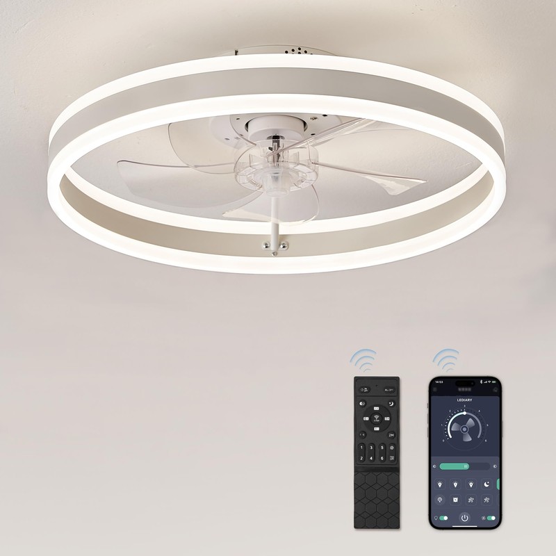 LEDIARY Low Profile Ceiling Fans with Lights, Flush Mount Modern Ceiling Fan and Remote Control, 19.7" LED Bladeless Ceiling Fans, Stepless Dimmable 3 Colors and 6 Speeds - White