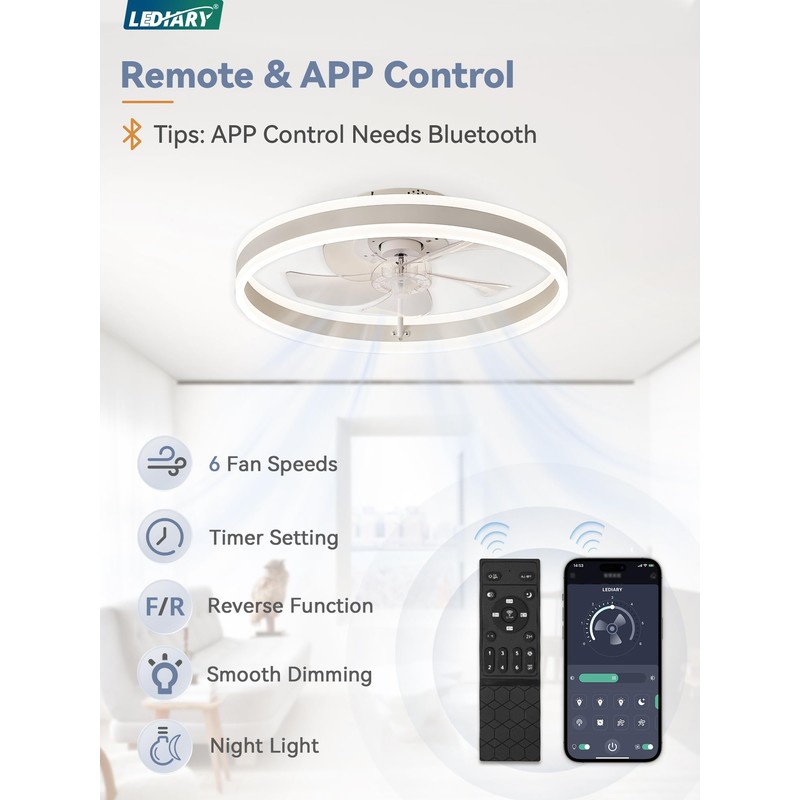 - Remote Control & APP Control: This flush mount ceiling fan with light has 5 blades with 6 speeds and sleep timer (1H or 2H) settings. Remote smart control makes it easy to free your feet. Tips:App control requires Bluetooth