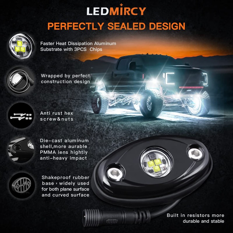 - ▷▶ Upgraded Design White LED Rock Lights Kit◀◁ These white led rock lights kit come with switch wire harness;It design with 180° tilt angle and toughed PC lens reinforced to prevent frontal impact,reduce impact strength,disperse force,avoid damage to the lens,and can bounce off frontal impact objects.It can highly resistant to heavy impacts.Great design for better cooling,durable,fast heat dissipation and up to 80000 hours lifetime.