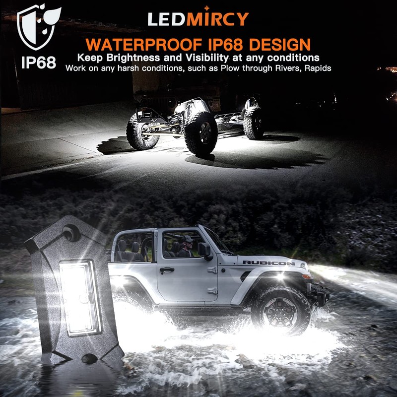 - ☼ Waterproof Impacts Upgrade Design: Die cast aluminum shell of the white rock lights be filled full with IP 68 Glue Layer Into Lamp Body, Which Seal Rubber Waterproof Ring At Front Len,The IP68 Waterproof Designed is Specially For Most Bad Conditions / Practical Scene, such as: Muddy Roads, Swamp Lakes,Wetland Grassland. Waterproof,Rust-Proof and anti corrosion.Be used at any conditions such as in the heavy rain, harsh environment.