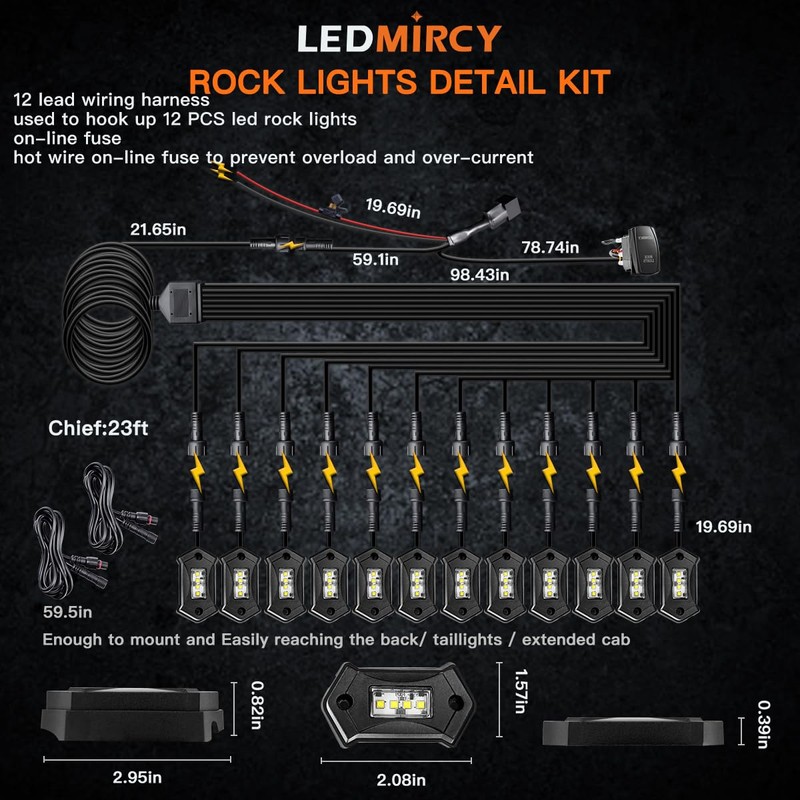 - ☼ Easy to Install the Position: 23.3ft harness kit enough to connect where you want, drill a hole to hook up this rock lights, and used the wire harness kit to hook all the lights; then connect the electrode wires to your vehicle power. The 5 feet extension wire is easily reaching the back of your vehicle, taillights. the package Include12PCS Rock Light, 12PCS×Rubber Pads, 2x 12PCSSets Screw and Nuts,1Sets 23.3ft Wire Harness kit, 2PCS 58.5 In Extension Cable,1PCS Installation instructions.