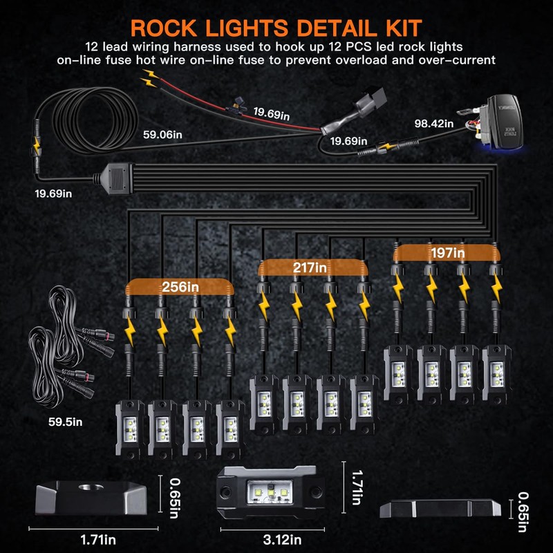 - [Easy to Install]:with 23.3 ft flexible copper rock lights harness kit come as well fuse and 2pcs 5 feet extension wire is enough to mount your rock light anywhere on your vehicle,easily reaching the back of your vehicle,taillights,then connect the electrode wires to your vehicle power.The package included 12PCS rock light,12PCS×rubber pads, 2x12 sets screw and nuts,1sets wire harness kit,2PCS 5 ft extension wire,1PCS installation instructions and provide 2 year risk-free warranty.