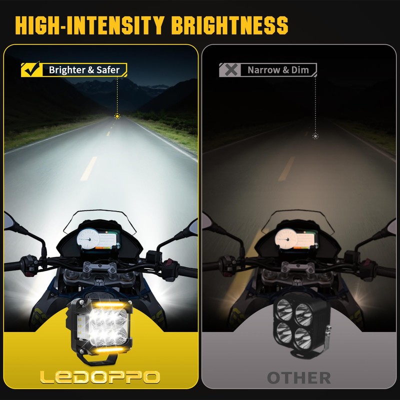 - 【270° Dual Side Shooter Beam】LEDOPPO Motorcycle Driving Lights Combines Spotlights With Dual Side Shooter Lights (They Always Light Up Together),Offer An Extra-Wide 270° Flood Light to Giving Great Light Coverage And Long Range Beam Pattern,Provide A Super Bright Wide Angle Panoramic Flood of Illumination,Improve Overall Visibility.