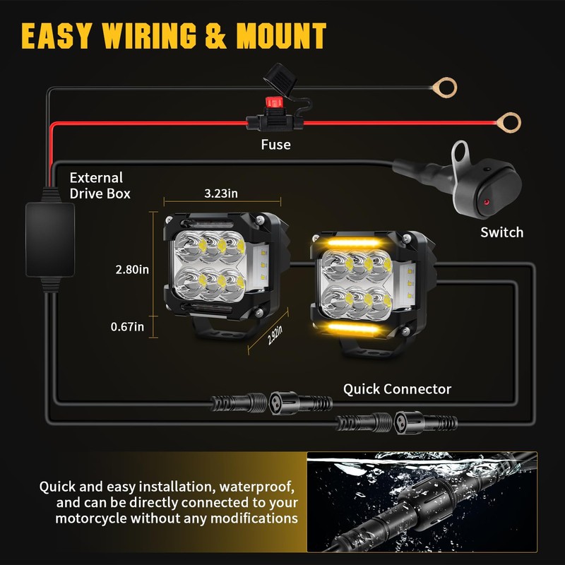 - 【6 Lighting Modes】V5 Motorcycle Spotlight Integrated With 6 Modes. 3 Constant Light Modes: 1),White Spot + Side Shooter(Always Light Up Together); 2),Amber DRLs; 3),DRLs And Spot + Side Shooter Light Cluster. 3 Strobe Modes: 1), Amber DRLs Strobe; 2), White Spot + Side Shooter Light Strobe; 3) Amber DRL & White Spot + Side Shooter Alternating Strobe.And Strobe Lighting Is More Likely to Catch The Attention of Other Drivers, Especially Suitable For Overtaking, Blind Spot Turning, And Warning.