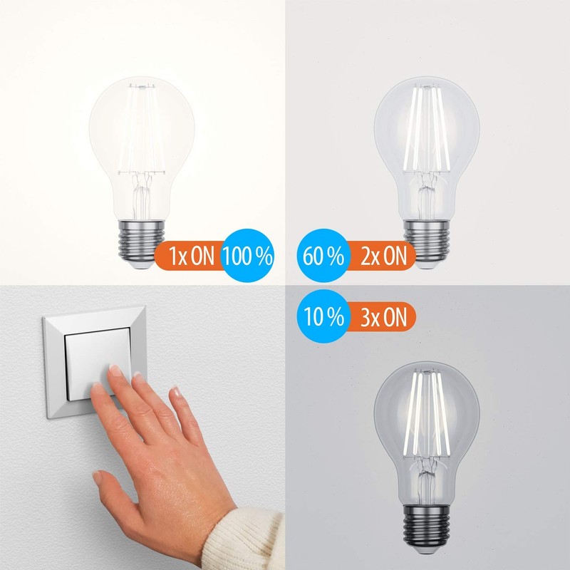 By switching your conventional light switch several times, you can choose between three brightness. The bulb always starts with full brightness, followed by 60% and then 10% of the output brightness.