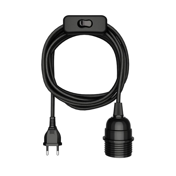 ledscom.de Leka Textile Cable, Plug, Switch, Black, 3 m, Lamp Socket, 1x E27 Max. 60 W, Cable, Lamp Cable, Cable Lamp, Switch, E27, Rope, Pendant Light, Lamp Holder, E27, Textile Cable