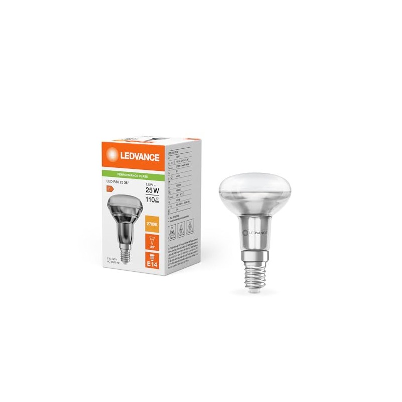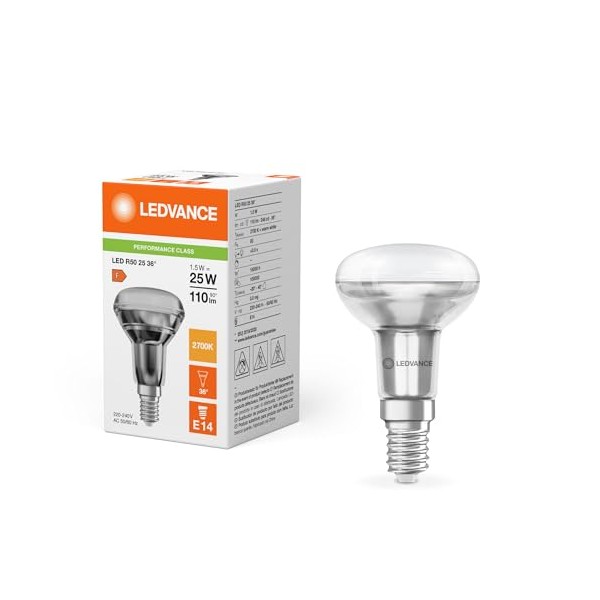 - Ledvance Performance LED Spotlight E14 R50 1.5 W 110 lm 36D - 827 Extra Warm White Replacement for 25 W