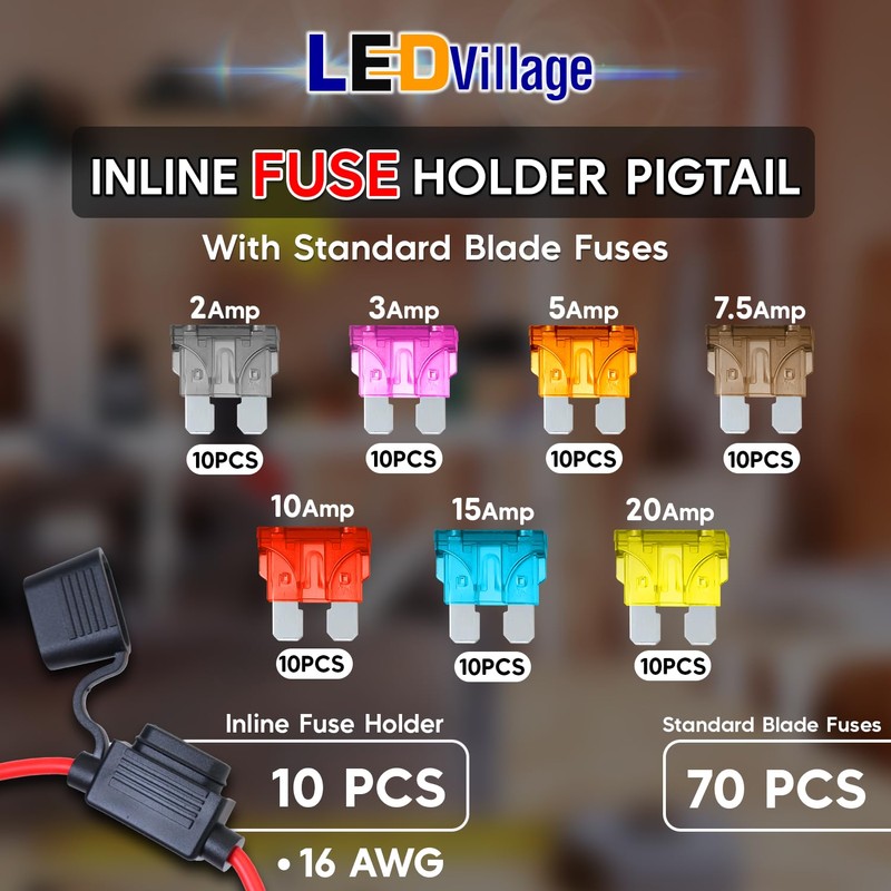 Ledvillage Pack of 10 Inline Fuse Holder 16AWG 1FT – Heavy Duty Automotive Blade Fuse Holder 2A/3A/5A/7.5A/10A/15A/20A Ideal for Car, Marine, Solar, and RV Applications (70 Fuses in Set)