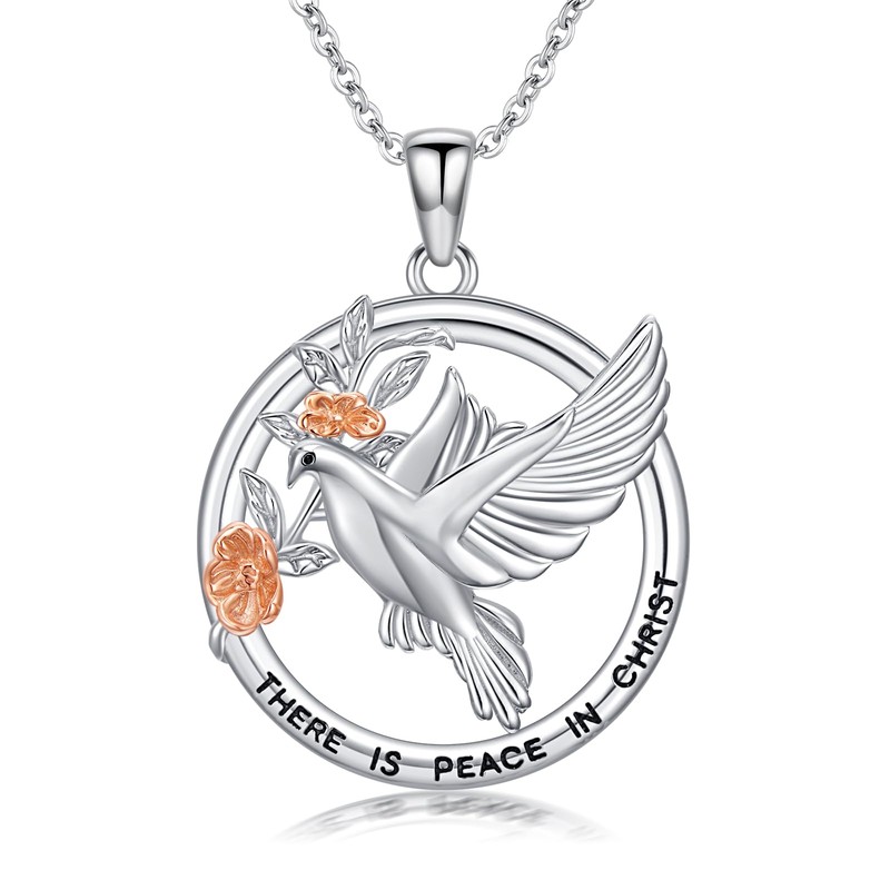 - ❤Material❤: This dove necklace is made of sterling silver, which is rust-proof, nickel-free, lead-free, cadmium-free and hypoallergenic. The dove pendant will not fade or lose its luster over time. The dove is plated with white gold, the flower is plated with rose gold, and the words "THERE IS PEACE IN CHRIST" are plated with black glue. The necklace is simple and elegant without losing its beauty.