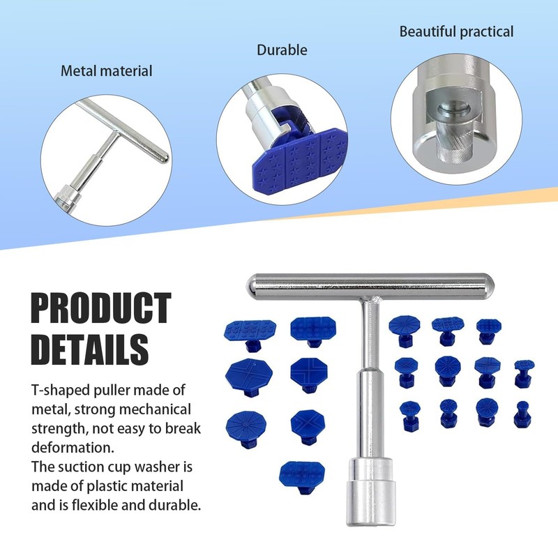 - How to Use: First clean the dent and keep it dry and dust-free, choose a suitable gasket, coat it with viscose, stick it on the dent of the car body and wait for five minutes, then use the T-type repairer to buckle one end of the suction cup, pull the repairer to make the suction cup produce outward traction, and repeat the above steps until the dent of the car body is repaired flat.