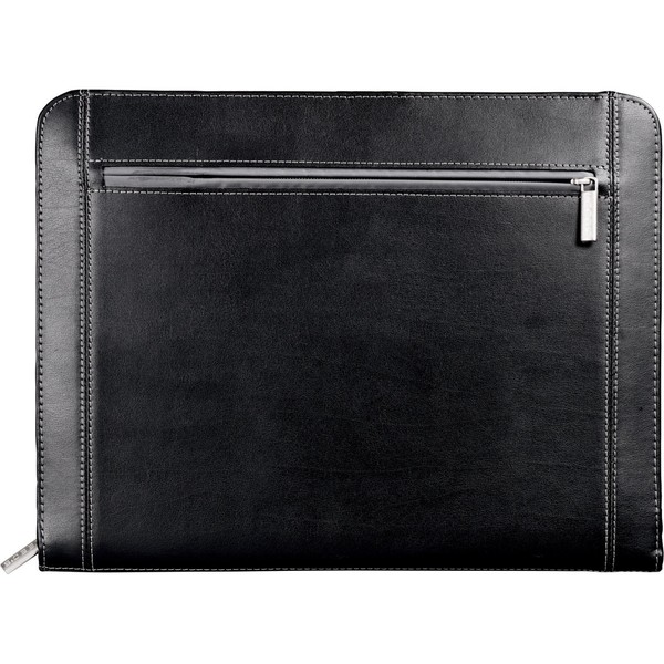 - Bonded leather portfolio features a zippered closure and front pocket.