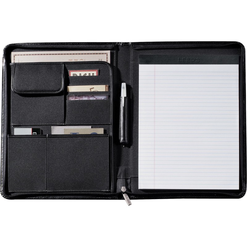 Zippered closure. Interior organizer with business card pockets, document folder and pocket with closure. Front zippered pocket. Includes 8.5" x 11" writing pad.