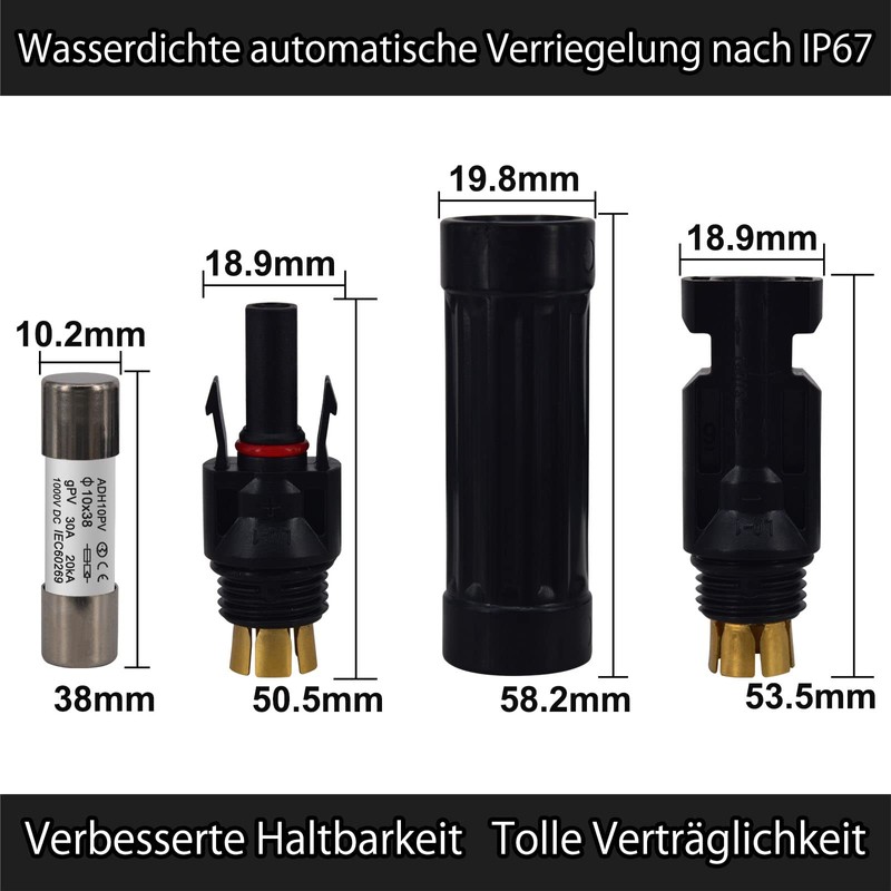 - High-quality material: the solar connector is made of high-quality PPO + copper material, is robust and durable for long-term use, PPO housing and tin-plated copper connectors ensure product resistance of less than 1 mΩ and meet UL94 V0 flammability standards.