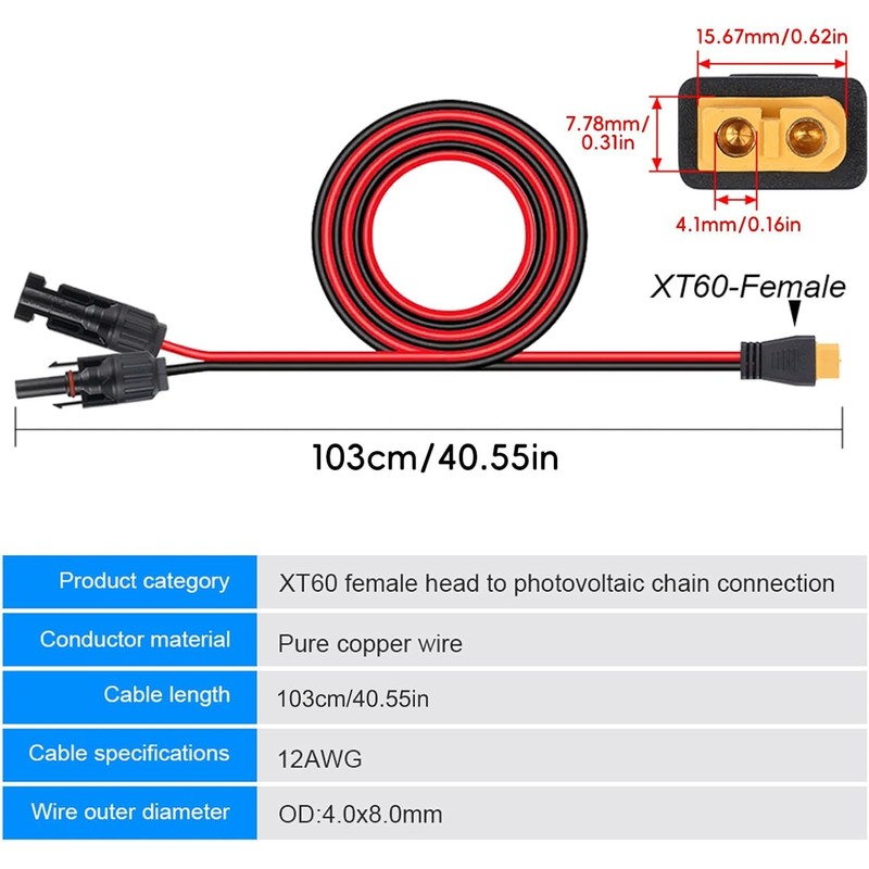 - 【High Quality 12AWG Solar Connection Cable with XT60 Adapter】The 12AWG cable with oxygen-free tinned copper conductors ensures efficient 30A power supply via the solar port to the XT60 adapter cable and features weather resistant insulation for operation in temperatures from -40°C to +105°C - ideal for demanding solar applications.