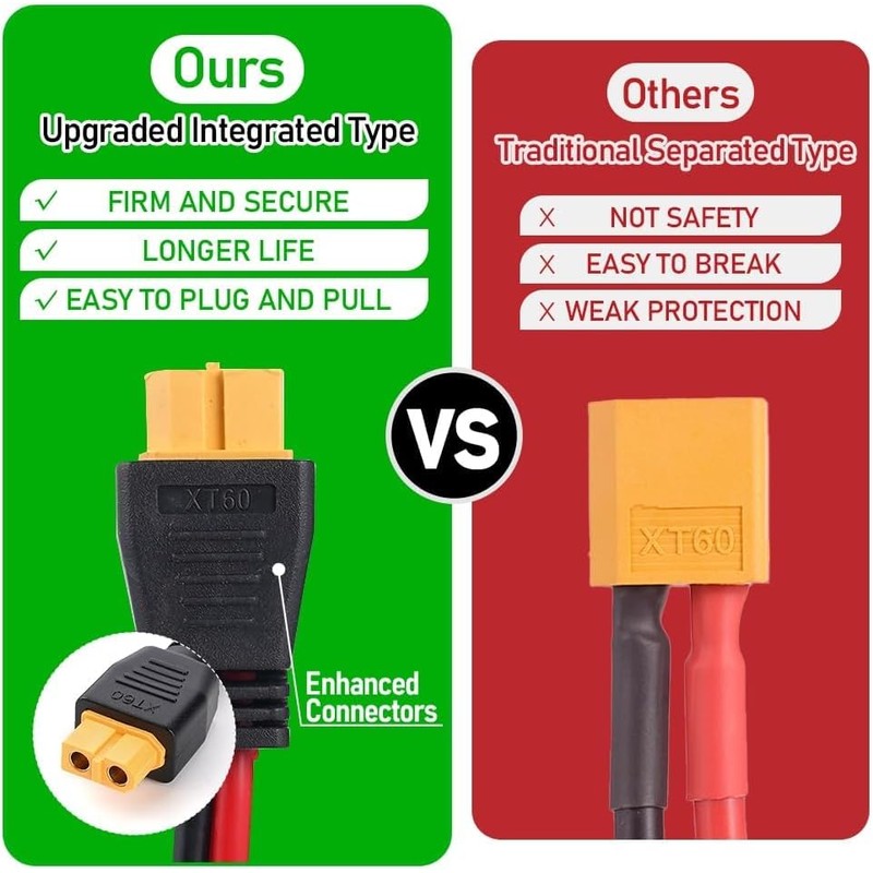 - Safe and durable: This intelligent extension cable from XT60 to solar panel has built-in reverse polarity protection that automatically protects your devices from wrong connectors. Our reinforced XT60 adapter can withstand more than 20,000 mating cycles, making this solar port to XT60 adapter cable three times more durable than standard connectors.