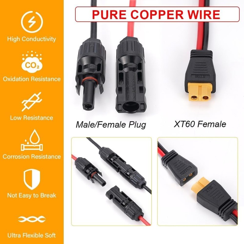 - High efficiency: This XT60 to solar charging cable is made of oxygen-free copper wire with low contact resistance and high current and high voltage load capacity (up to 600V), which ensures faster transmission, minimises power loss and charges your devices safely and efficiently. Voltage: 300V Rated current: 30A, Conductor resistance: (20°C) ≤≤3.5Ω/KM.
