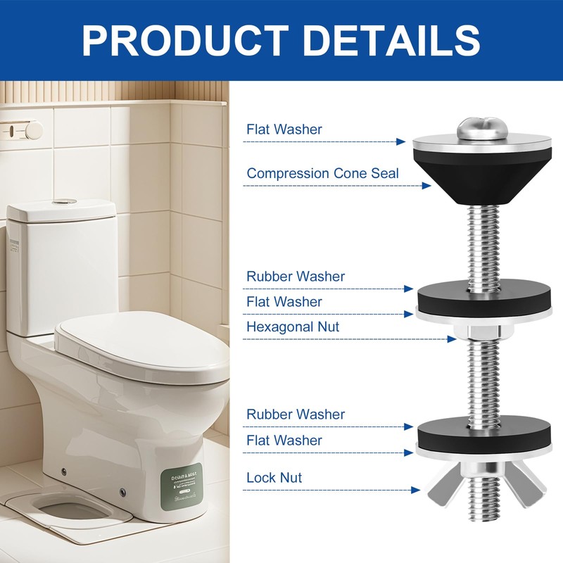- π£ππππππ ππ‘πππ¨ππ: 2 PCS toilet seat bolts, 2PC compression cone seal, 4PCS rubber washer, 6PCS flat washer, 2PCS hex nut, 2PCS lock wing nuts