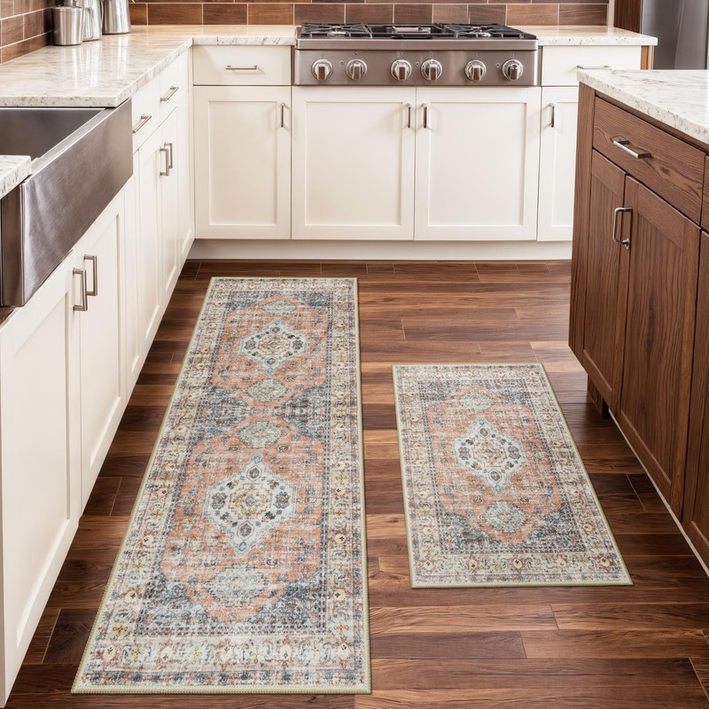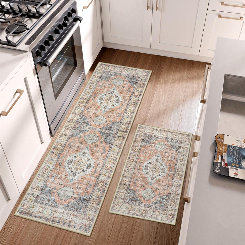 LEEVAN Kitchen Rug Set of 2, Washable Kitchen Mat for Floor Non Slip, Vintage Orange Kitchen Runner Rug, Soft Standing Mats Low-Profile Absorbent Laundry Mat Office Mat(20''x31'+20''x47'')