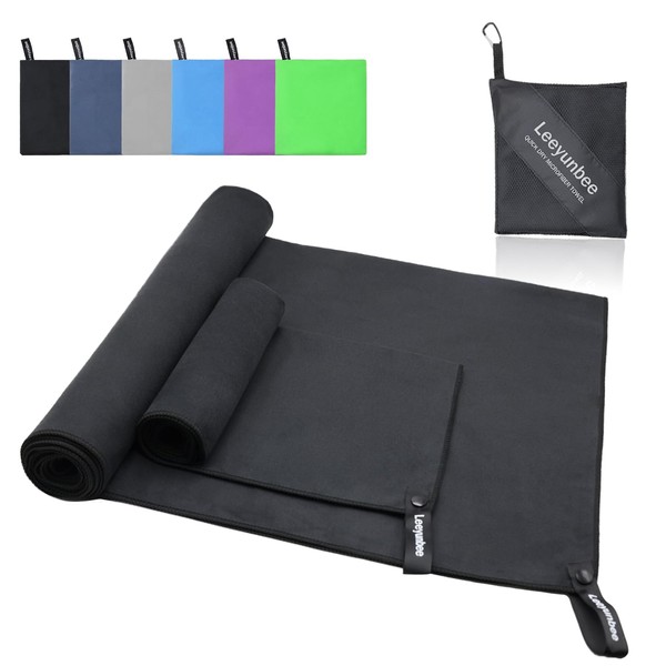 Leeyunbee Microfibre Towel Set of 2 - 160 x 80 cm Bath Towel Large + 80 x 40 cm Small Towel, Quick-Drying Sports Towel, Compact Microfibre Towels, Travel Towel, Beach Towel (Black)