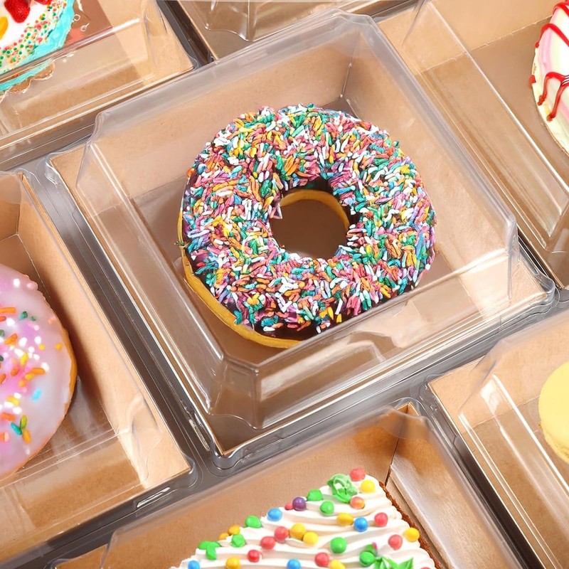 - Premium Material: The clear lid bakery boxes are made of sturdy kraft paper and food-grade PET plastic, recyclable. These to-go small boxes are reliable and stackable, which make it easy to transport.Each disposable charcuterie box has a polyester coating, which can prevent sauces or oils from soaking through, sturdy and clean.