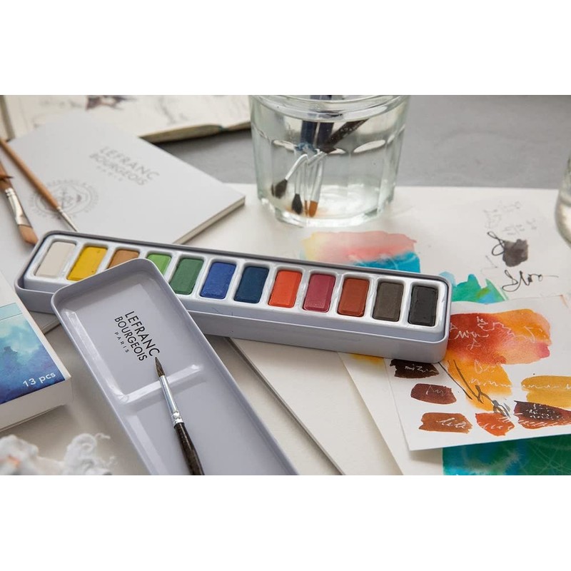 Lefranc & Bourgeois 301444 Watercolour Set with 12 Strong Studio Watercolour Paints, High-Quality Watercolours with Excellent Light Fastness, Transparency, Brilliance - 12 Colours, 1 Round Brush No. 8