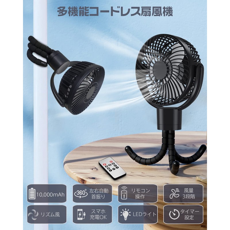 [Left and Right 360° Automatic Oscillating & 10,000 mAh] Rechargeable Fan, USB Fan, Portable Fan, Small Size, Circulator, Remote Control, Off Timer, 3 Levels, Rhythm Style, LED Light, Hanging, Placing, 3-Way, Portable, Heat Prevention, Outdoor, Disaster