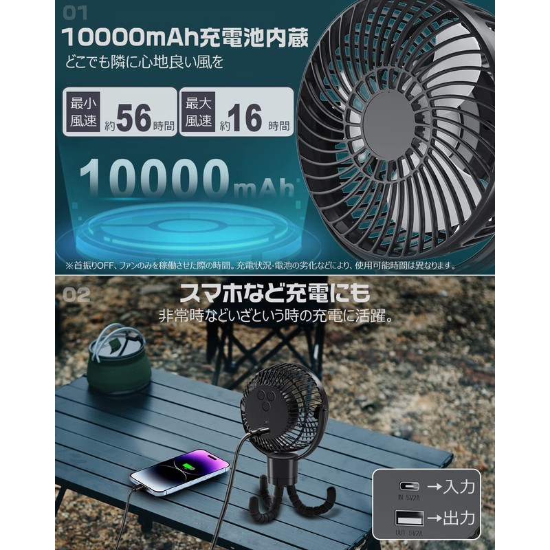 - Built-in 10,000 mAh Rechargeable Battery & Cool Anywhere: Built-in high capacity 10,000 mAh lithium-ion polymer battery. When fully charged, it can be used continuously for about 56 hours in minimum mode. You will feel comfortable even when you go for a long time. This 3-way portable fan has a flexible arm that allows you to create the perfect shape for any location you use it. It can be used in 3 different ways, including rolled, hanging, and placing. It can be used in a variety of settings, regardless of indoor or outdoor use