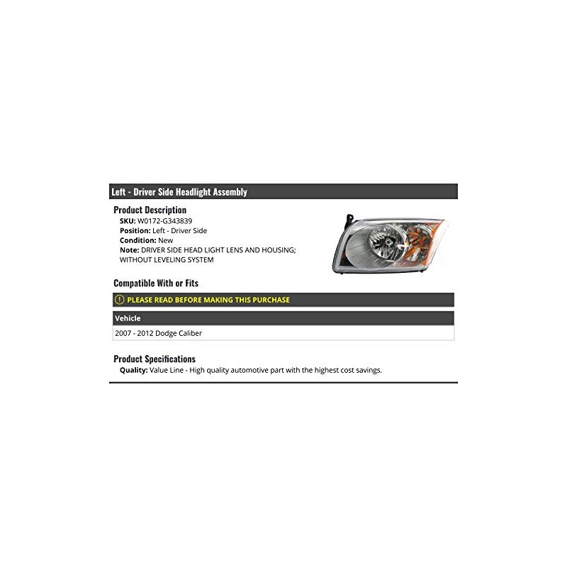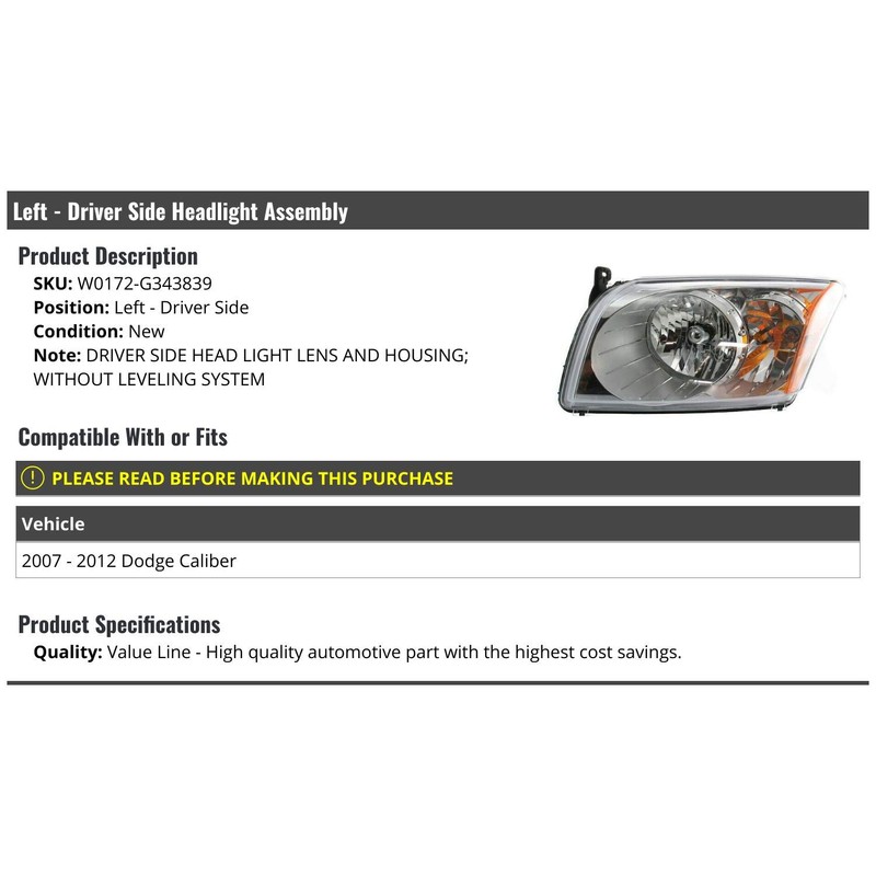 Left Driver Side Headlight Assembly - without Leveling System - Compatible with 2007-2012 Dodge Caliber