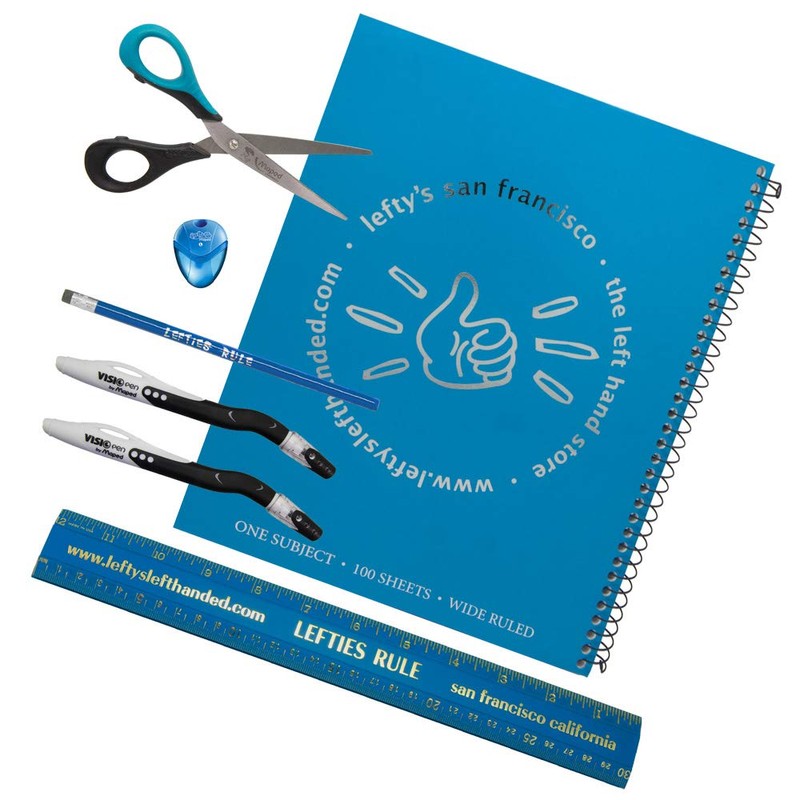 This great left-handed middle school set includes a Lefty's logo wide-ruled notebook, Lefty's Rule pencils and ruler, Maped student scissors and pencil sharpener, and the 2-pack of left-handed hooked neck Visio pens. 1 Lefty's Logo Wide-ruled Notebook. The cover of this notebook proudly proclaims it to be the property of a Lefty, with the Lefty's San Francisco Left handed Thumb's up Logo. Wide-ruled sheets are especially designed to help young lefties learn to form letters. One subject, 8" x 10.5",100 sheets, opens left to right with the spiral on right side for left-handed writing convenience, holes punched on left side, perforated for easy tear sheets. Left-handed Maped Student Scissor. 6" pointed scissor with hands molded for left-handed use by smaller hands. These scissors have ergonomic 3D rings in the handles, so they are easy both to hold and to use. 1 Left-Handed Ruler. Colorful plastic ruler printed with "Lefties Rule" has numbers reversed so they read from right to left, far easier for lefties to work with. 1 2-Pack of Visio Pens (1 black and 1 blue). Our best-selling product, the new Visio pens have a hooked neck so lefties can see what they're writing, often for the first time, as well as an ergonomic left-handed grip and fast-drying ink. 1 pencil printed with "Lefty's Rule" reading so that only lefties see it the right way around, and 1 Maped pencil sharpener, designed to rotate counter-clockwise especially for left-handed kids. Lefties feel much more equipped for school when the basic supplies work for them. The notebook has spirals on the right, so lefties hands don't push into the spirals when they write. The fast-drying Visio pens are great for kids learning to write, because they can see what they're writing while holding the pens in the correct ergonomic position. True lefty scissors, the right size for a middle schooler, completely change the experience of cutting. Left-handed rulers help with learning measuring and math.