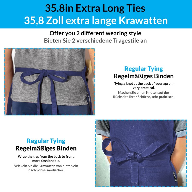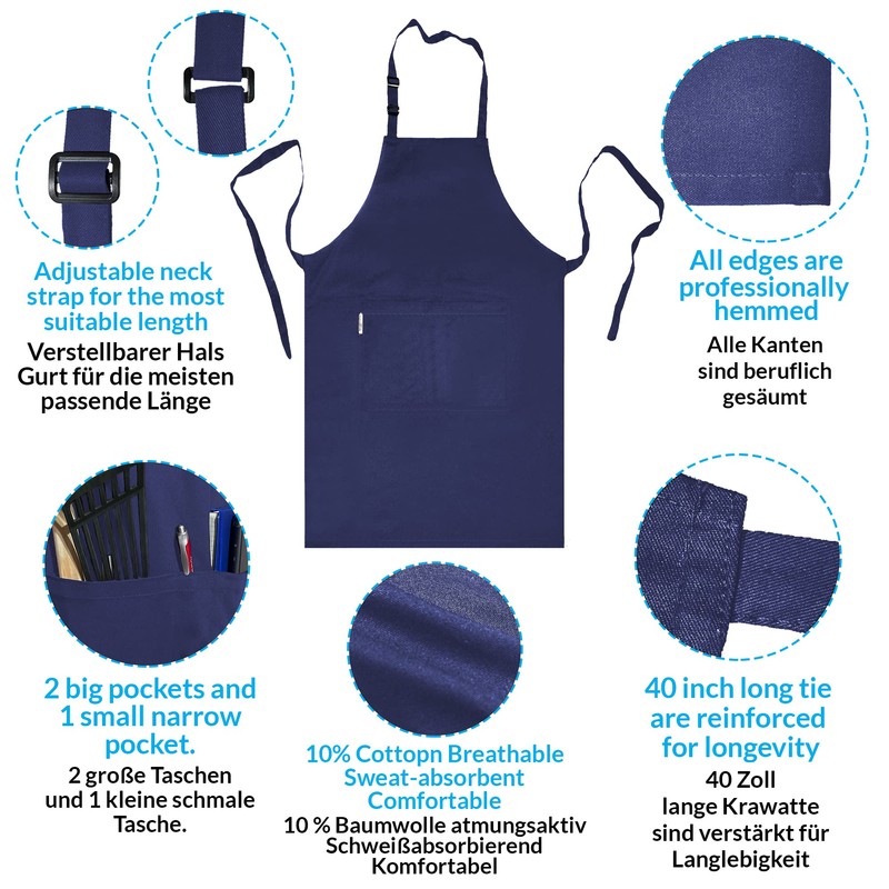 - Apron: The length of our apron (65 x 85 cm) can be adjusted with the neck and belly bands as needed, perfect size for most people, suitable for both women and men. The front part of the apron is equipped with 2 large pockets and 1 small/medium pocket.