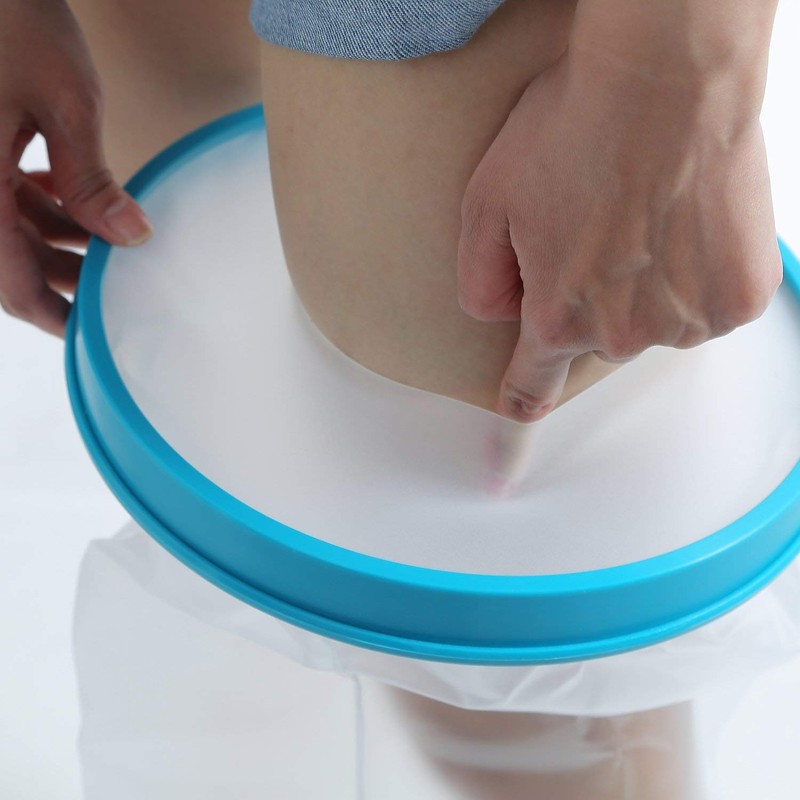 - Waterproof leg protector for shower. The opening seal is made of medical grade elastic silicone. Easy to pull over the cast and bandage. The protecting bag is made of thick and impermeable PVC, better to keep the water out.