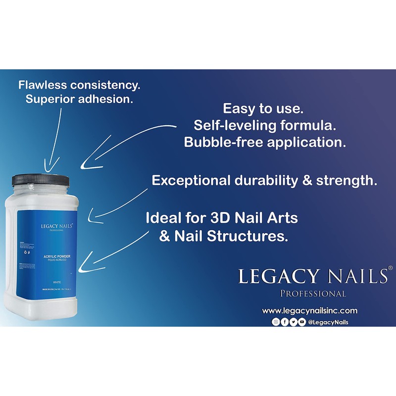 - ✨ Legacy Nails White Acrylic Power has a special formula that provides flawless consistency, superior adhesion, self-leveling, and bubble-free application while delivering exceptional strength and durability.