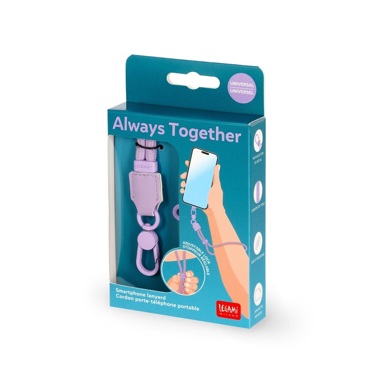 - You and your smartphone - no one can ever separate you. Especially if you always wear it on your wrist with the mobile phone cord - Always Together - Lilac from Legami: a universal phone cord that is easy to position and impossible to lose!