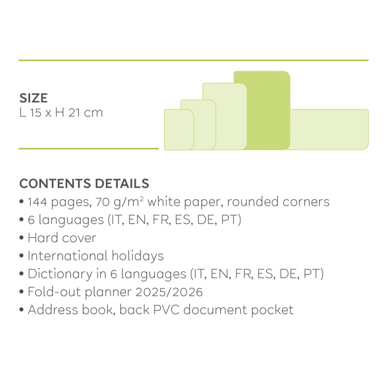 - Features: Hardcover. 144 pages of 70gsm white paper and rounded corners. PVC Document Wallet. Includes international holidays, address book and foldable planner 2025/2026. Elastic closure 6 languages: IT, EN, FR, ES, DE, PT.