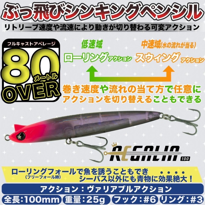 • Concept: Variable action that changes movement depending on retrieve speed and flow speed, and horizontal fall, you can create a variety of attack methods. Seabass Sinking Pencil
