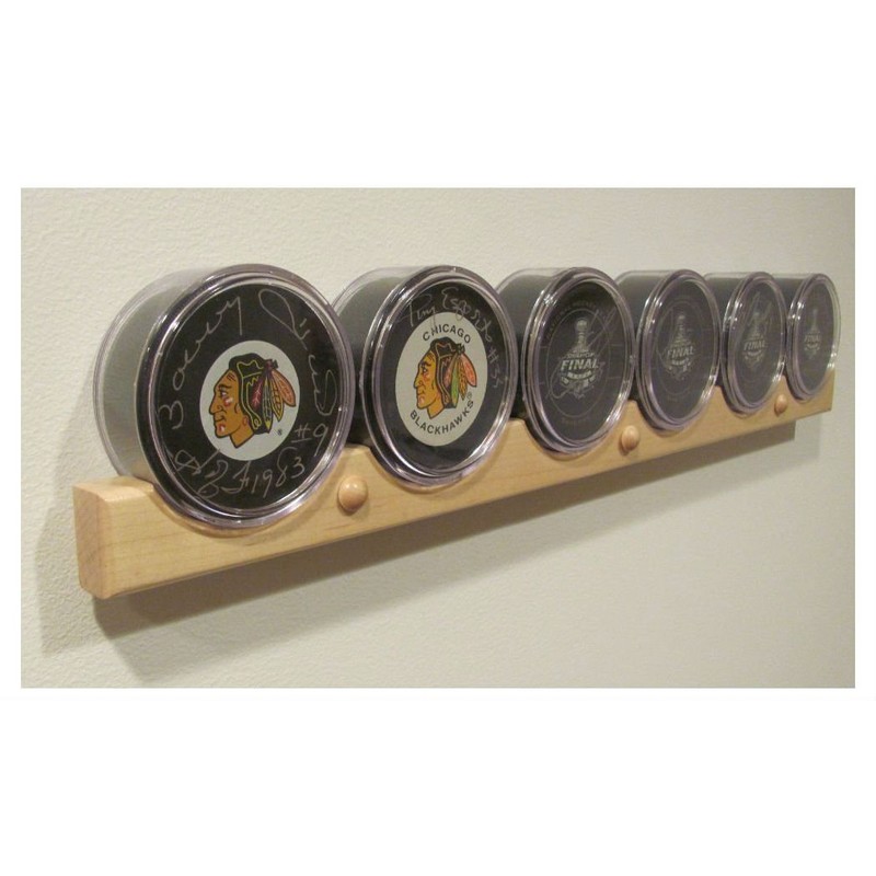 - ● Our puck racks are a great, affordable way to display your collection of hockey pucks on any home or office wall. Our puck racks are designed to hold loose pucks or pucks that are in plastic tube puck holders. We take a lot of pride in every puck rack that we make. Our puck racks are made from Maple and finished with three coats of semi-gloss polyurethane.