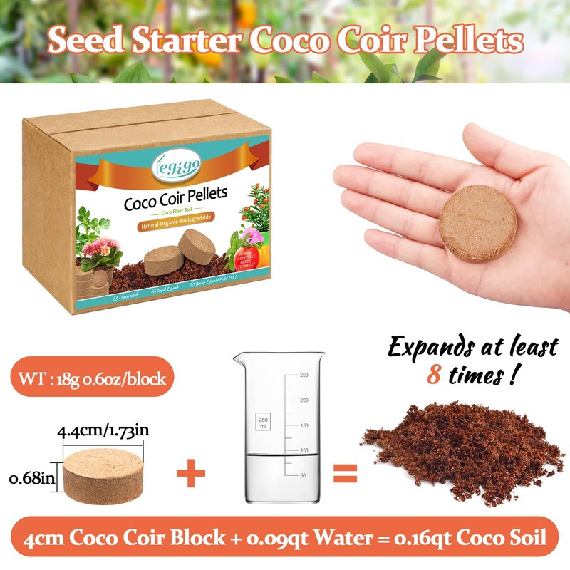 - Easy To Use: Place the coco coir peat in a container or pot, add the right amount of water (approx. 0.09 qt of water per block), wait for it to swell, squeeze out the excess water, organize the shape of the coconut soil medium, and place your seeds or plants in the middle. When transplanting, simply place the entire coconut soil medium into a larger container or garden, without removing the medium